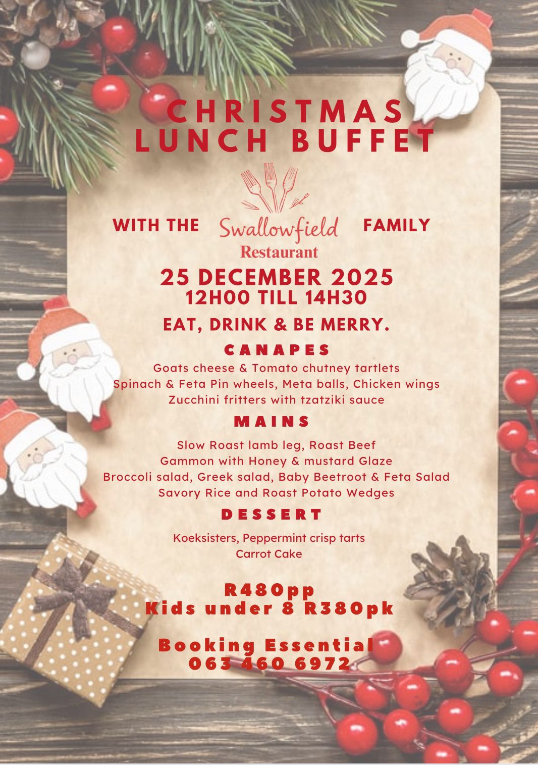Delicious buffet spread for the whole family. Booking essential 063 460 6972