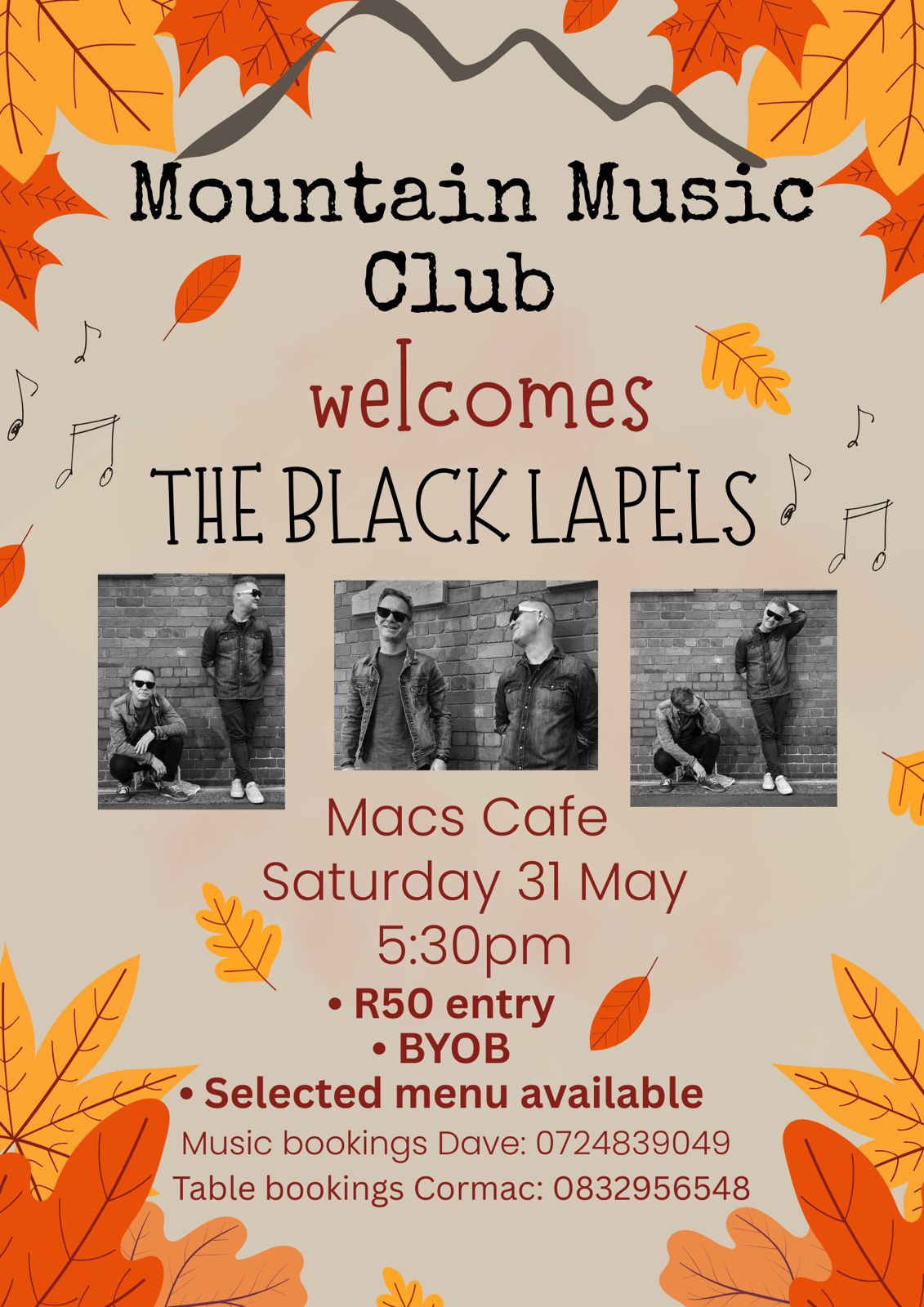 Guest Artist “The Black Lapels”. R50 entry. Bring own drinks. Bookings 0832956548