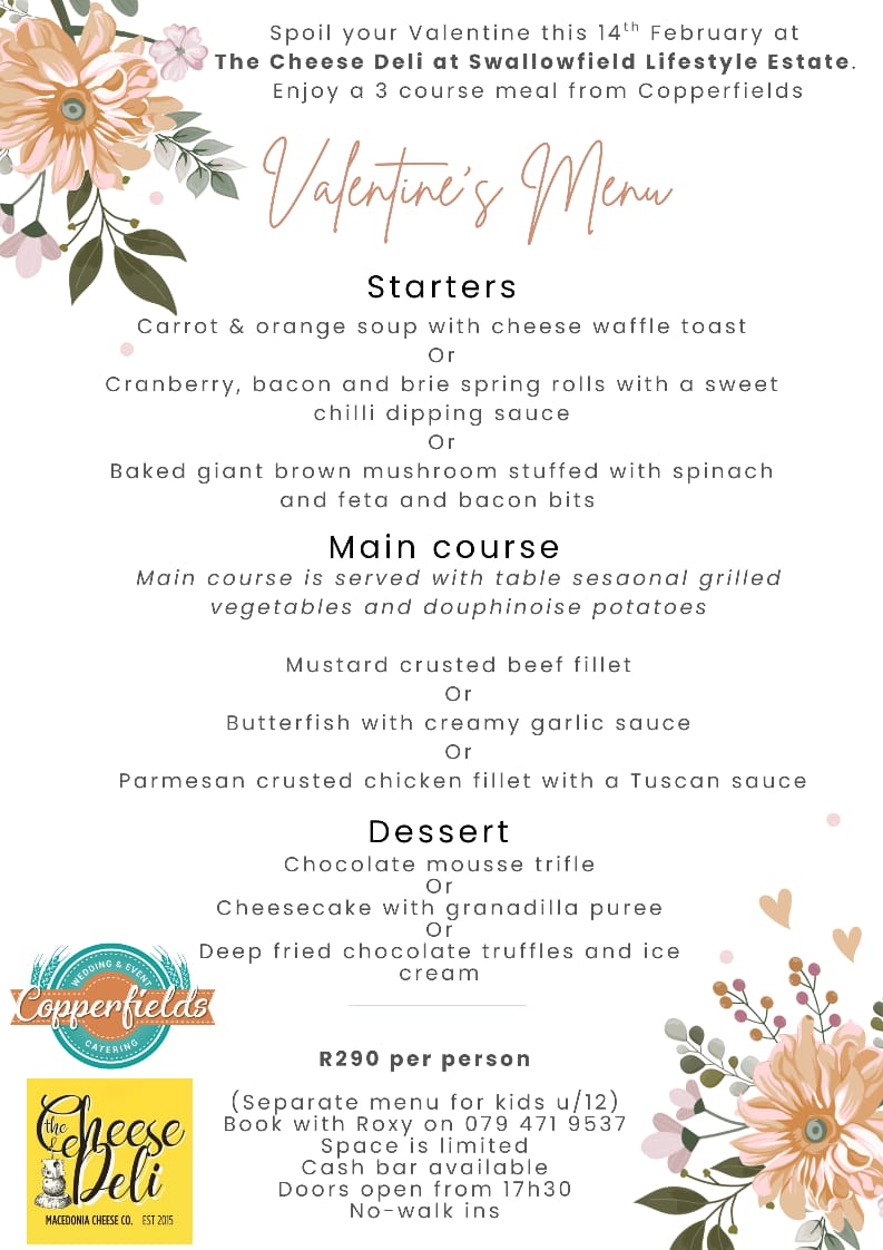 3 Course Dinner R290 per person. Booking Essential 079 471 9537